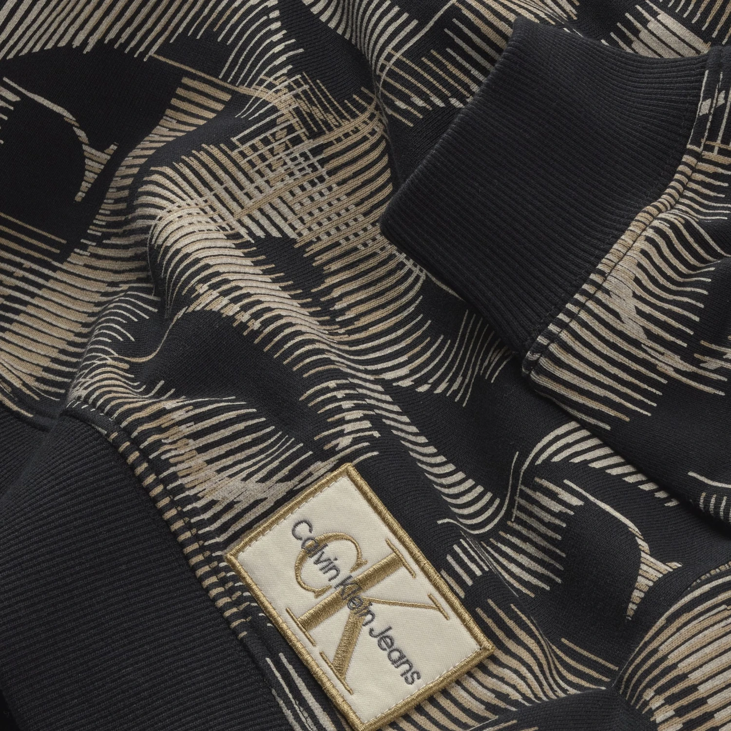 Calvin Klein Kapuzenpullover in Schwarz mit Allover-Print von CK in Beige und Weiß. Unten auf der linken Seite ist das Markenlogo. Der Calvin Klein Hoodie hat lange Ärmel und eine feste Kapuze. In der Taille und in den Armöffnungen befinden sich breite, gerippte Kanten und der Kapuzenpullover hat einen ansprechenden Look.