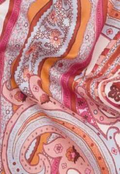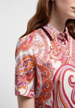 Moderne und alltagstaugliche Kurzarmbluse mit orientalischem Paisley-Print. Die Bluse hat einen Hemdkragen und einen leicht abgerundeten Saum (RL 70 cm, AL 25 cm). Durch den Riegel am Ärmel ist die Armlänge variabel verstellbar und es sind verschiedene Tragevarianten möglich. Hochwertiges, bügelleichtes Satingewebe (100% Baumwolle) verleiht einen luxuriösen Glanz und ein angenehmes Tragegefühl.