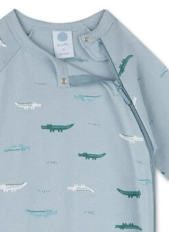 Jungen-Overall in einem schönen Blauton und einem Alloverprint aus verschiedenfarbigen Krokodilen.