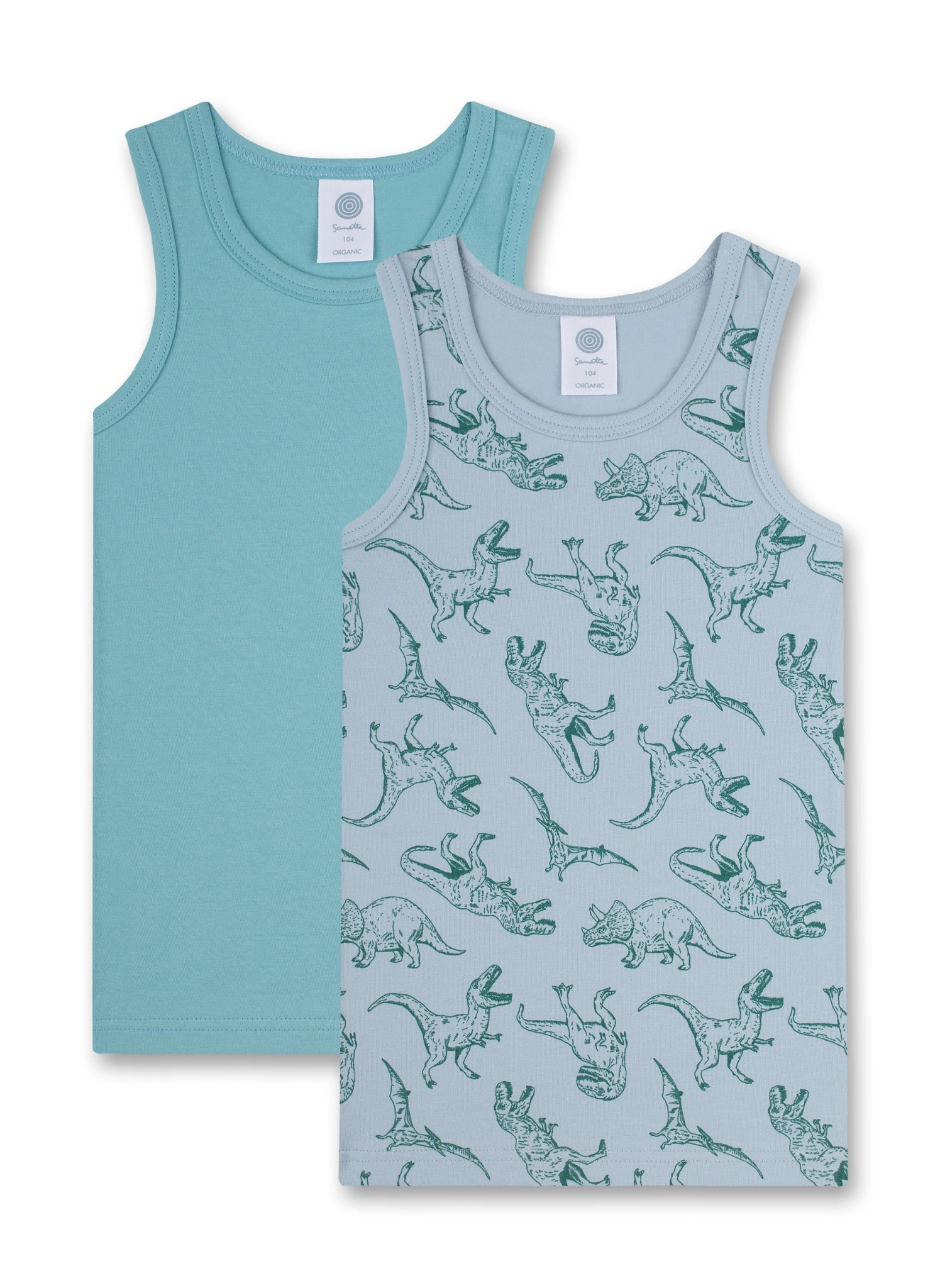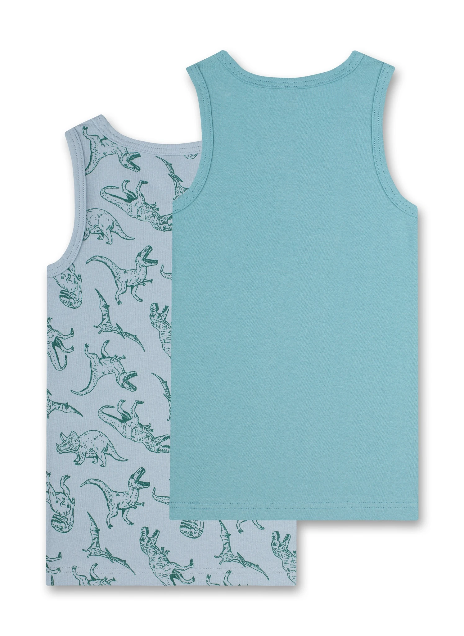 Jungen-Unterhemden von Sanetta im Doppelpack im coolen Dino-Alloverprint und in zeitlosem Hellblau.