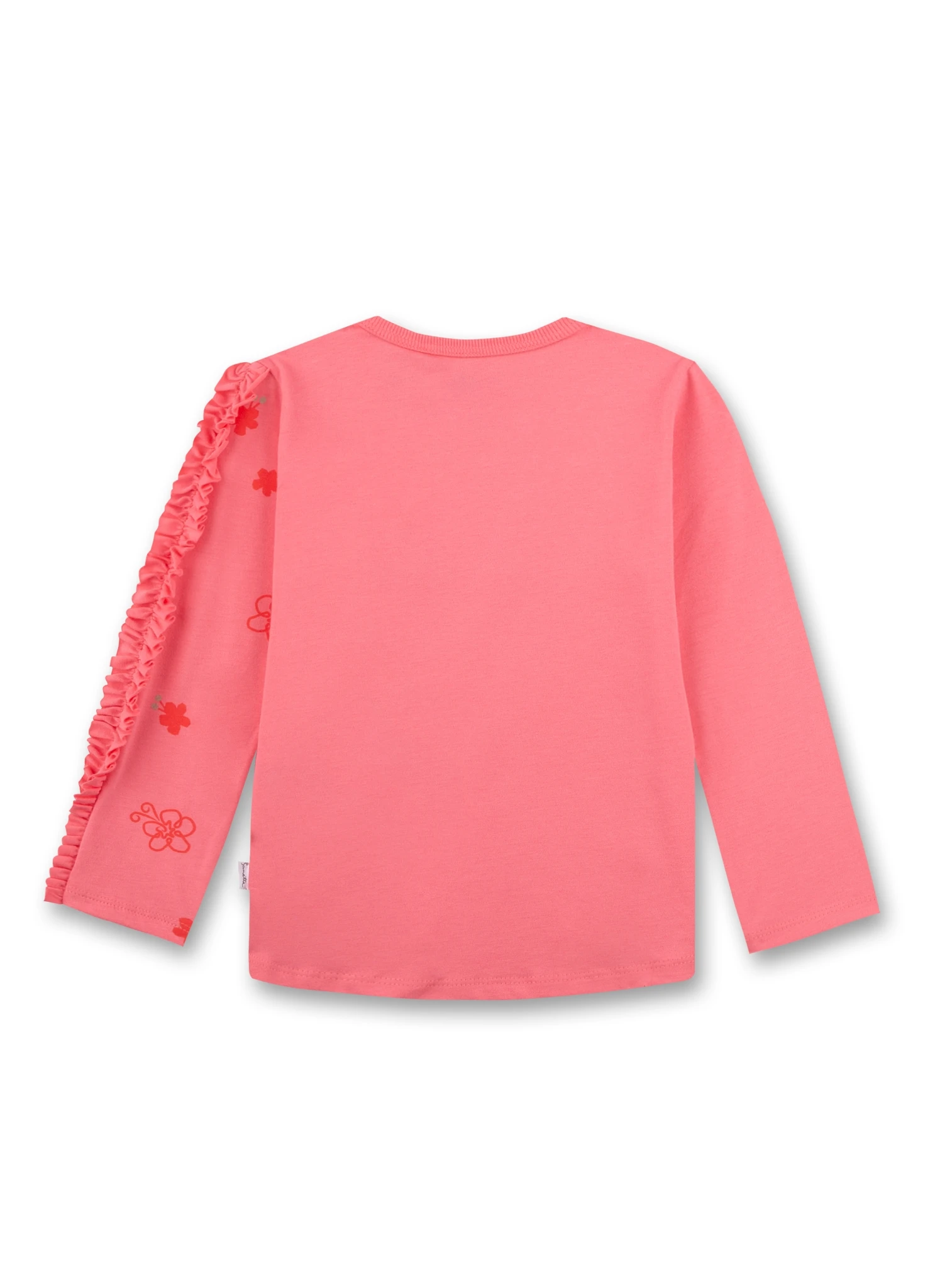 Bequem fallendes Mädchen-Longsleeve von Sanetta Kidswear in Pink mit einem kreativen Pferde Artwork und Rüschen an der Armseite.