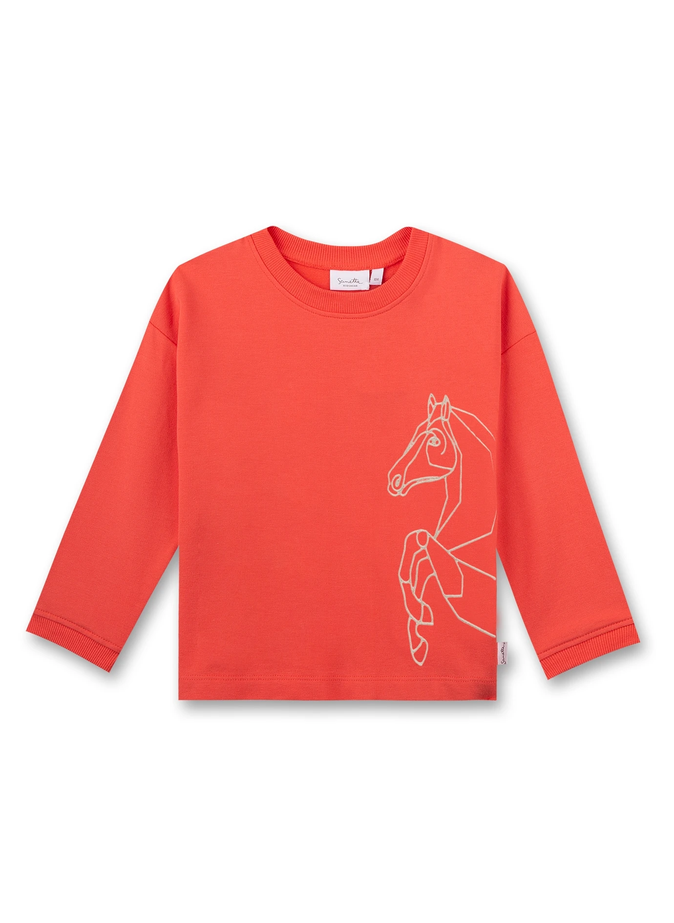 Mädchenhaftes Sweatshirt in Pink von Sanetta Kidswear mit einem großen Pferde Artwork in modernen Outlines.