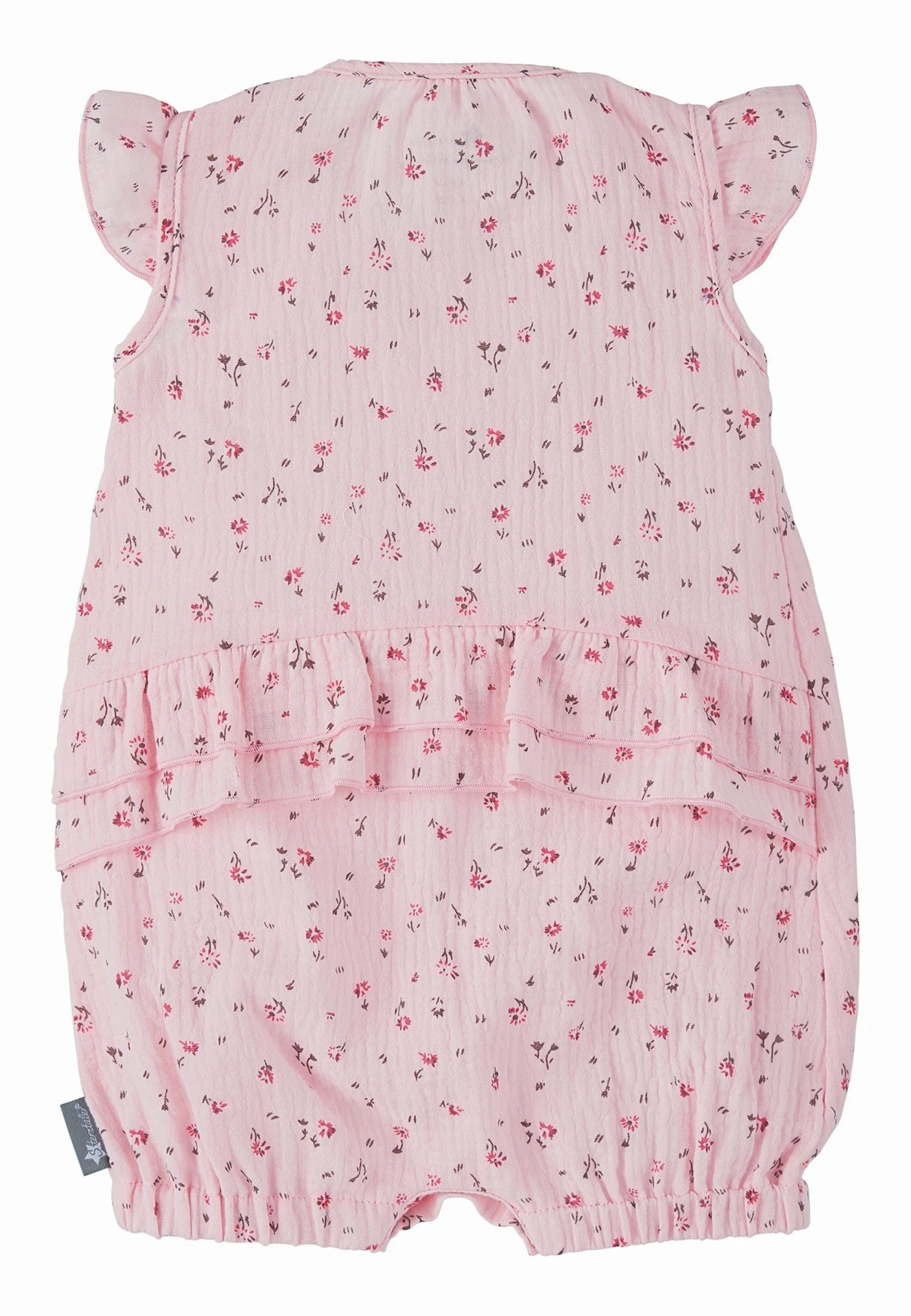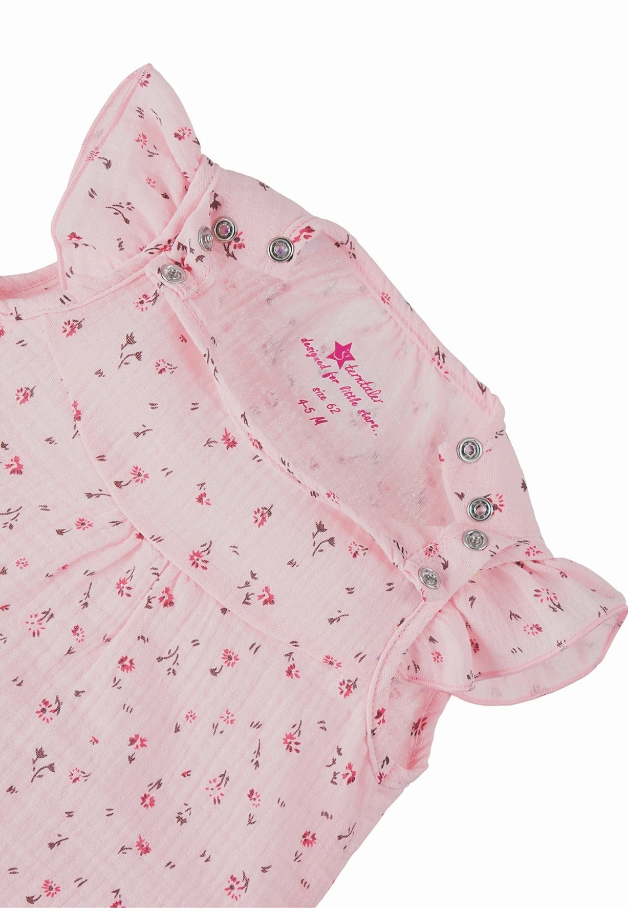 Mit diesem tollen Spieler aus Mousselin Ware mit kleinem Blütendruck sind die Kleinsten an heißen Tagen entspannt unterwegs. Verspielte Akzente werden durch die Flügelärmelchen und die kleinen Kräuselfalten unterhalb der Passe gesetzt.